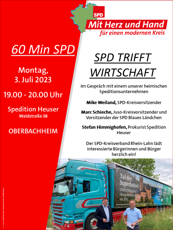 Die regelmäßigen Austausche mit der heimischen Wirtschaft liefert stets aufregende Einblicke in den Status der heimischen Unternehmen. Besonders die letzten Monate waren für viele Unternehmen sehr herausfordernd und ein Ende der schwierigen Zeit ist noch nicht in Aussicht. Aus diesem Grund entschied sich der SPD-Kreisvorstand die anstehende Ausgabe der 60 Minuten SPD-Reihe mit dem Speditionsunternehmen Heuser in Oberbachheim zu veranstalten. Kreisvorsitzender Mike Weiland, der als Bürgermeister der VG Loreley zu einem Brandeinsatz gerufen wurde, ließ sich kurzfristig entschuldigen. Marc Schieche, Vorsitzender der SPD Blaues Ländchen, übernahm die Begrüßung der Zuhörerschaft und hieß alle Anwesenden herzlich willkommen.
