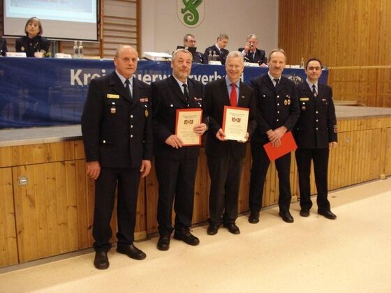 RHEIN-LAHN-KREIS | Auf der Kreiskonferenz 2013 der Freiwilligen Feuerwehren des Rhein-Lahn-Kreises in Birlenbach wurden für Ihre Verdienste im Feuerwehrwesen mit der Ordensspange des Kreisfeuerwehrverbandes Rhein-Lahn die Feuerwehrkameraden Klaus Langschied aus Birlenbach-Fachingen, Manfred Hofmann aus Eppenrod und Frank Puchtler aus Oberneisen vom Kreisfeuerwehrverbandsvorsitzenden Gerhard Bingel und seinem Stellvertreter Michael Dexheimer auisgezeichnet.