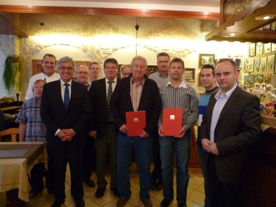 Geehrt wurden für 45-jährige Mitgliedschaft Willi Rahn (5. von rechts) und Markus Kalkofen (3. von rechts) für seine 25-jährige Mitgliedschaft in der SPD. Es gratulierten unter anderem der SPD-Landesvorsitzende Roger Lewentz, Fraktionssprecher Jürgen Dedekind, Ortsvereinsvorsitzender Mike Weiland, sein Stellvertreter Andreas Kahl und Ortsbürgermeister Frank Kalkofen.