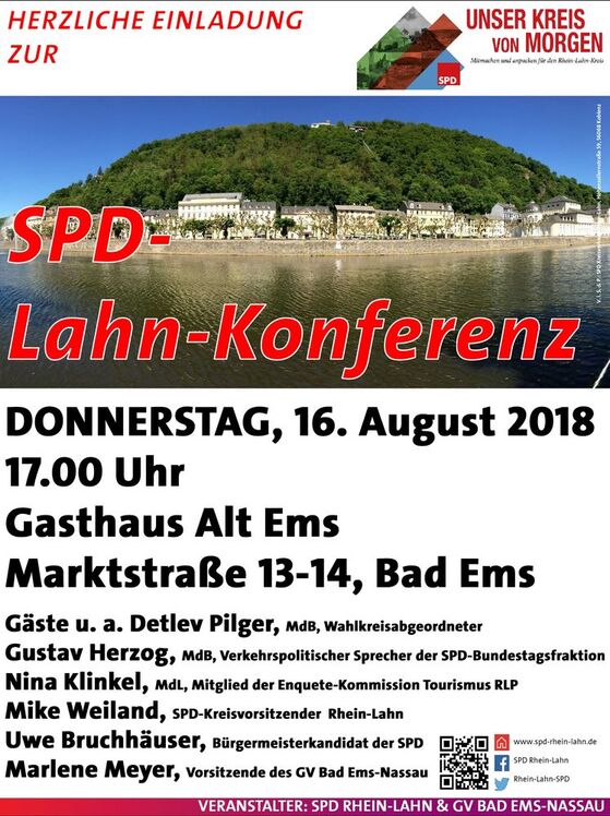 Zu einer SPD-Lahn-Konferenz kommen am Donnerstag, 16. August 2018, um 17.00 Uhr, Aktive der SPD aus den Verbandsgemeinden Bad Ems und Nassau, der Kreis-, Landes- und Bundespolitik im Gasthaus Alt Ems, Marktstraße 13-14, 56130 Bad Ems, zusammen. "Die SPD Rhein-Lahn bietet eine Plattform um über die Zukunft der Themen Bundeswasserstraße Lahn und die Ausrichtung des Tourismus zu diskutieren", erklärt SPD-Kreisvorsitzender Mike Weiland als Veranstalter gemeinsam mit Marlene Meyer, der Gemeindeverbandsvorsitzenden Bad Ems-Nassau. Auch interessierte Bürgerinnen und Bürger sind herzlich eingeladen.